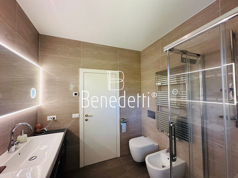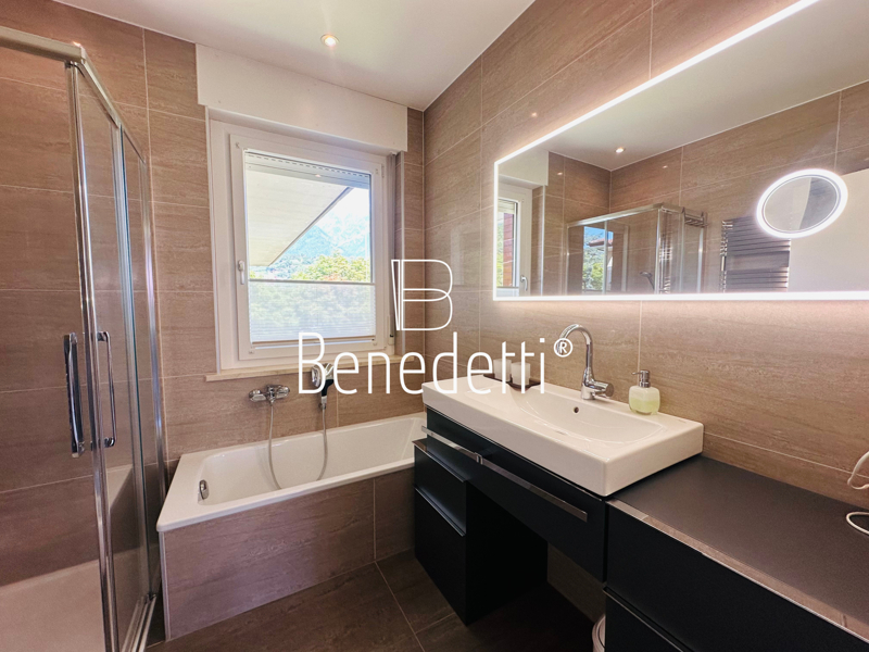 Das Badezimmer ist hochwertig ausgestattet mit Dusche, Badewanne und einem Fenster, das den Blick auf die umliegende Bergwelt freigibt. Das große Schlafzimmer bietet direkten Zugang zum Südbalkon, das zweite – etwas kleinere – Schlafzimmer öffnet sich zum Ostbalkon.