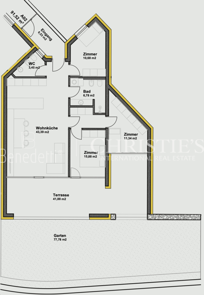 Die Wohnung WA02 überzeugt mit einer gelungenen Kombination aus moderner Architektur und großzügigen Außenflächen. Auf rund 91,52 m² Nettofläche bietet die Wohnung ein durchdachtes Raumkonzept, das sowohl funktional als auch repräsentativ ist.