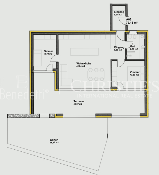 Das Wohnzimmer mit offener Wohnküche (ca. 26,9 m²) öffnet sich direkt zu einer sonnigen Terrasse von 46,37 m². Der private Garten mit ca. 58,95 m² lädt zum Entspannen im Grünen ein. Zwei Schlafzimmer sowie ein Badezimmer runden das Angebot ab und schaffen eine behagliche Wohnatmosphäre.