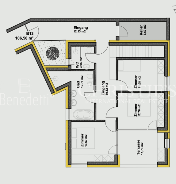 Die Wohnung WB13 gehört zu den größten und exklusivsten Einheiten des Ensembles Rosa Letzner Living. Auf 106,50 m² Wohnfläche (netto) bietet sie ein durchdachtes Konzept mit viel Platz, Helligkeit und direkten Zugängen ins Freie.