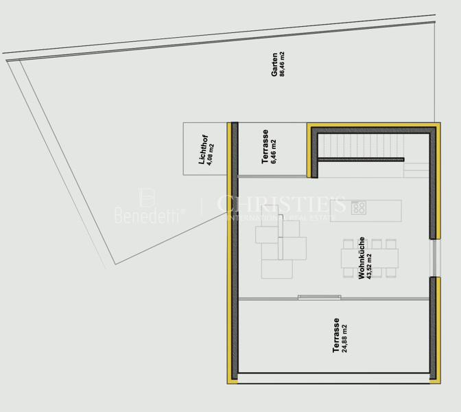 Das Herzstück ist die Wohnküche mit 43,52 m², die sich über große Fensterfronten auf die Terrassen mit insgesamt 43,07 m² öffnet. Der weitläufige private Garten mit 86,46 m² schafft zusätzlichen Lebensraum im Freien – perfekt für Familienleben, Entspannung oder Feste im Grünen.