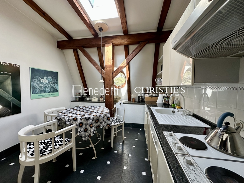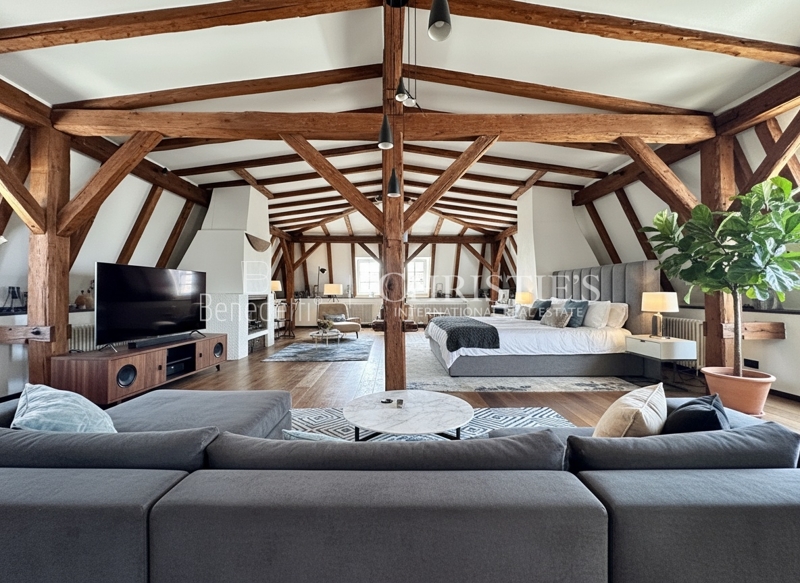 4. Stock – Das exklusive Penthouse präsentiert sich als weitläufiger Open-Space-Bereich (94 m²) mit edlem, massivem Holzboden, tollen Deckenbalken und einem aktiven Kamin, der eine gemütliche Wohnatmosphäre schafft. Von hier aus gelangt man auf die großzügige Aussichtsterrasse, welche das Highlight der Wohnung ist, mit beeindruckendem Panoramablick. Die Wohnküche mit Dachfenster ist einfach gehalten und auch das Badezimmer mit Badewanne bietet durch Einfachheit viele Gestaltungsmöglichkeiten.