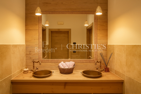 Die im Jahr 2011 neu errichtete Villa wurde nach den strengsten Kriterien der Bioarchitektur gebaut und verbindet traditionelle Baukunst mit moderner Eleganz. Schon beim Betreten empfängt Sie ein großzügiger Wohnbereich mit einem über 200 Jahre alten Holzboden und einem stilvollen Kamin aus Stein und Holz – ein Ort, der Wärme und Behaglichkeit ausstrahlt.