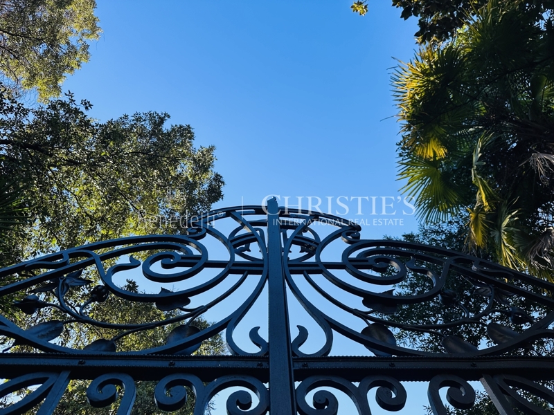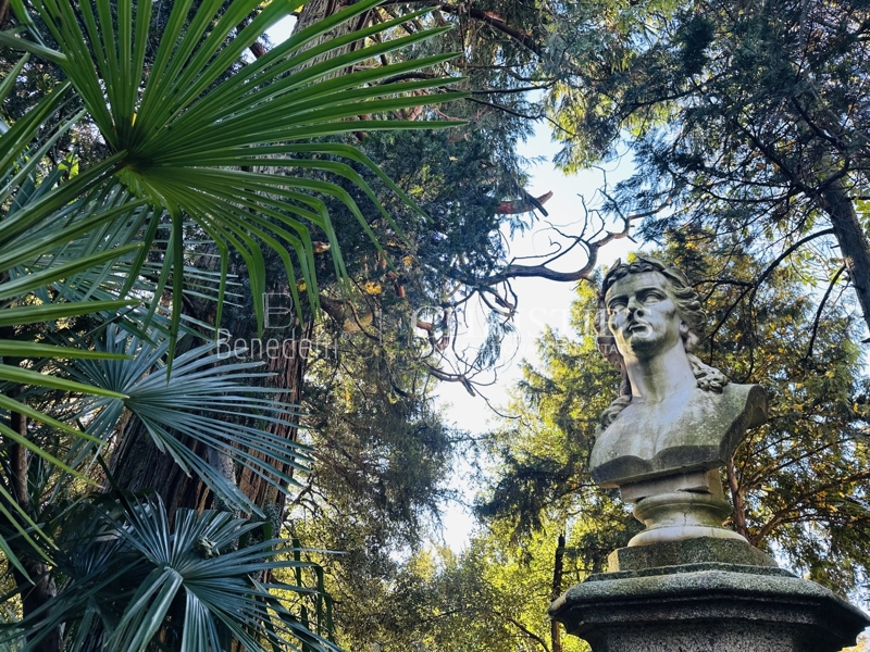 Rund um die Villa liegt ein gepflegter Garten mit alten Bäumen und Sträuchern. Hier gibt es auch Wege und Beete, die von Buchsbäumen eingerahmt sind.