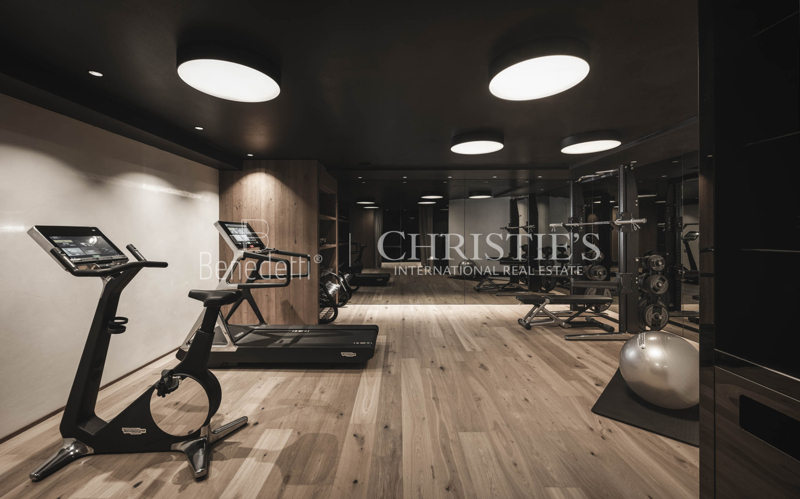 A highlight of the property is the private indoor spa, a true sanctuary of well-being featuring a whirlpool, sauna, steam bath, and sensory shower, complemented by a dedicated massage room. The chalet also offers a fitness room equipped with Technogym machines, as well as a dedicated yoga area.