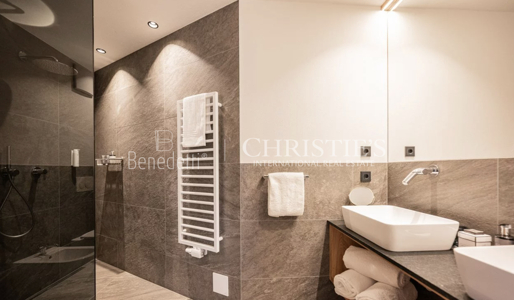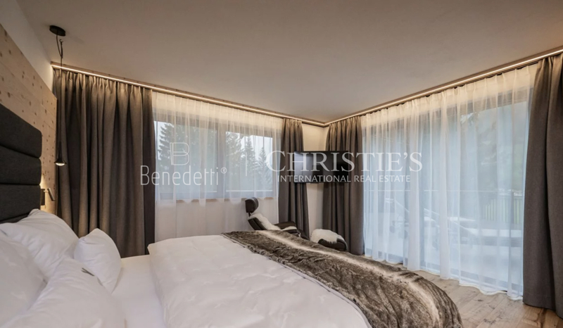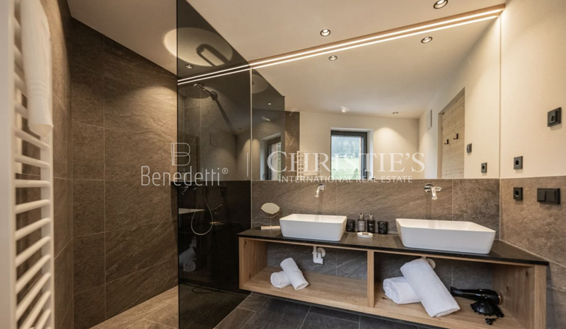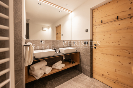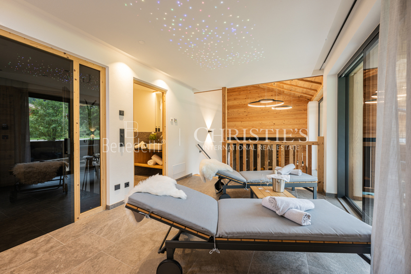 Im Erdgeschoss befindet sich ein eleganter privater Wellnessbereich, ideal, um nach einem Tag in den Bergen Momente der vollkommenen Entspannung zu genießen. Hier stehen eine Sauna, ein Whirlpool sowie ein komfortabler Ruhebereich zur Verfügung. Zudem besteht Zugang zu einer kleinen Außenterrasse, auf der man die frische Luft der Dolomiten genießen kann. Ein zusätzliches Badezimmer im Wellnessbereich sorgt für noch mehr Funktionalität und Komfort.