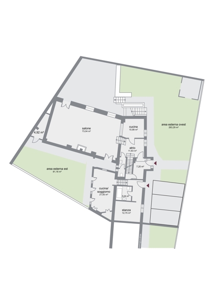 The second apartment is located totally on the ground floor and composed as follows: entrance, living room with open kitchen, bedroom, bath.