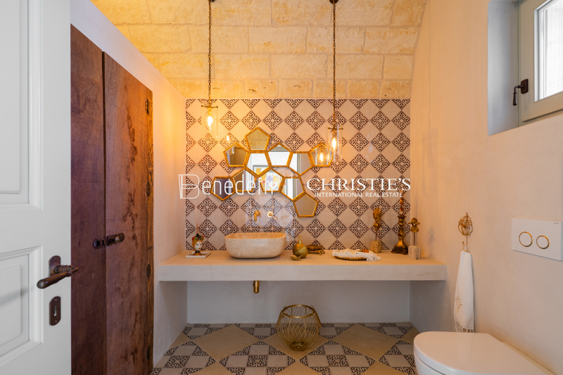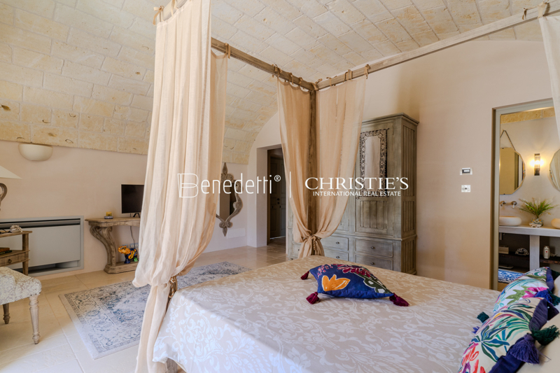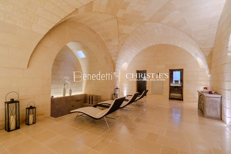 L'interno della Masseria si distingue per cinque ampie camere matrimoniali con bagno privato, un elegante soggiorno e zona pranzo, una cucina moderna, una lavanderia e un bagno per gli ospiti. Nel piano interrato si trovano una lussuosa spa con zona fitness, sauna, bagno turco, jacuzzi con cromoterapia e pavimento riscaldato, oltre a una cantina con frigorifero speciale e locale tecnico.