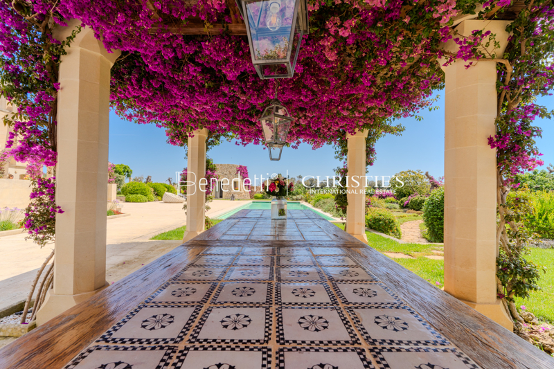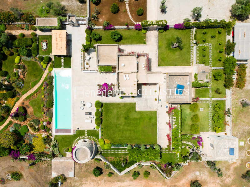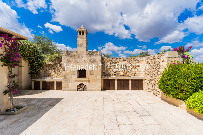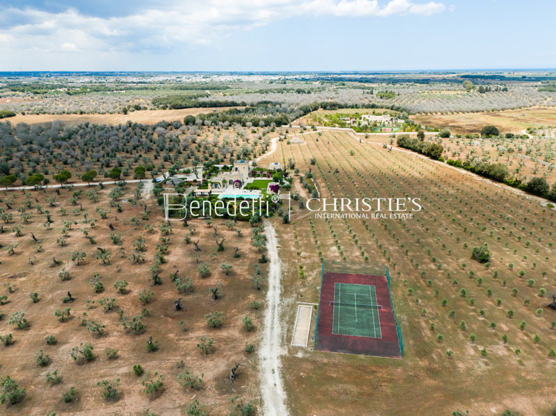 Gli spazi esterni offrono il massimo del comfort con una piscina riscaldata (19,5 x 5,5 m) e zona relax, un campo da tennis, bocce, ping pong, un forno a legna, un barbecue e due pergolati per pranzi all'aperto. Il giardino curato, con alberi da frutto, fiori e prati, crea un'atmosfera pittoresca che regala piacere durante tutto l'anno. La torre della Masseria offre una vista mozzafiato sulla campagna circostante e sul mare dalla sua terrazza panoramica.